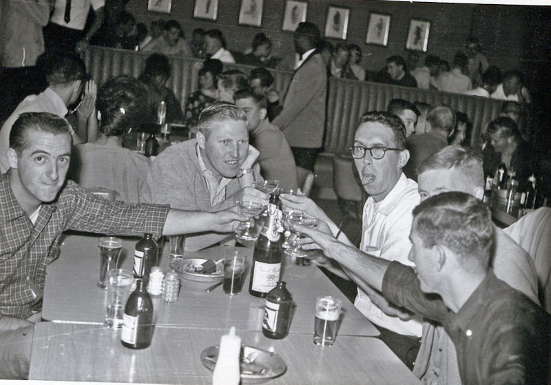 | Ron Ellingson (65-66) sent in a few items: Club Card, Chit Book and receipt. Also, here is a birthday get together, left to right, Dan Jenkins, Ron Ellingson, William Thomas (birthday boy), Tom Brosnan, Jack Diamond. Out of picture just before Dan Jenkings was Charles Trottman. |