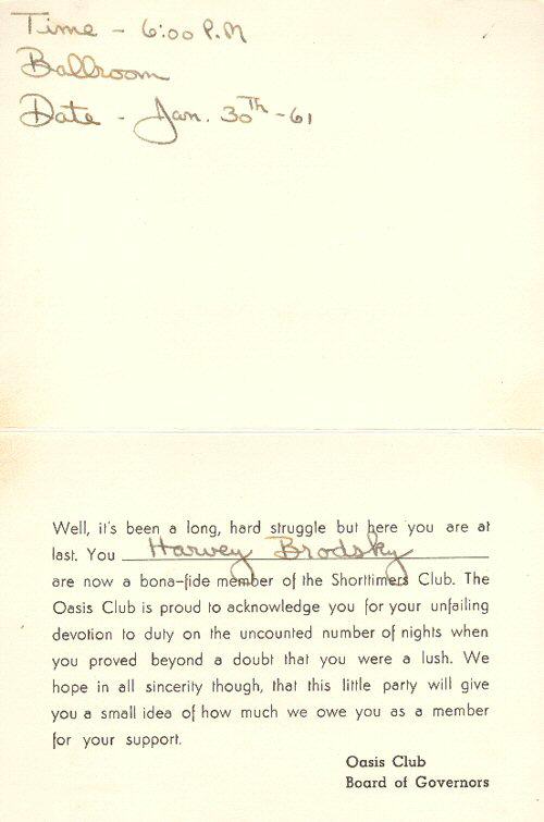 | Oasis Club Shorttimer's Card [Cover | Inside] courtesy of Harvey Brodsky |