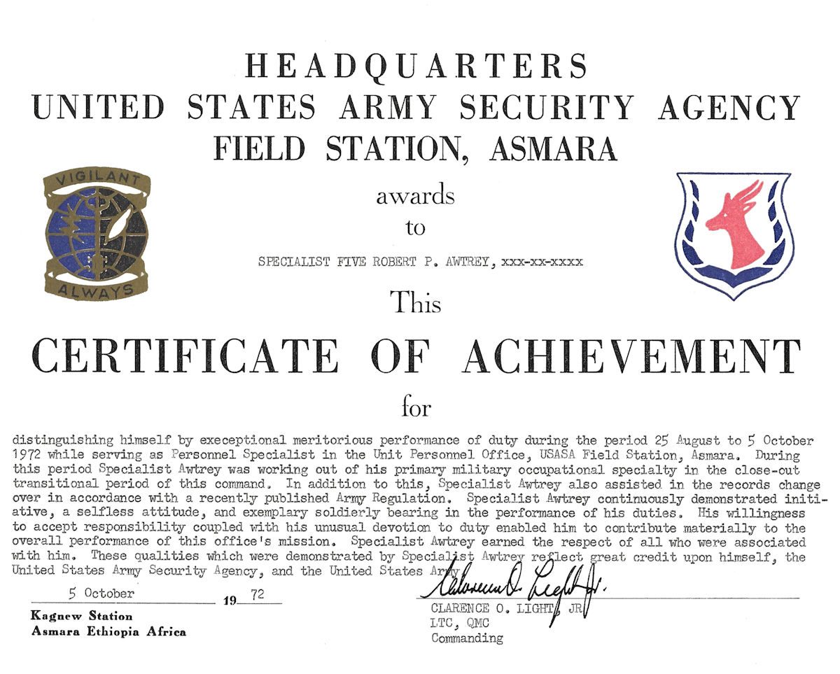 | From Robert Awtrey ASA Certificate of Achievement (1972) |