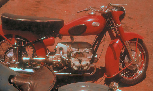 | This bike is a '55 Zundapp, before it was totally re-worked and painted a bright red. The Zundapp was 500cc twin horizontally opposed twin, made by BMW (Bavarian Motor Works) with drive shaft. It was one awesome motorcycle that was nearly destroyed after I had sold it just a month before clearing post, in a drag race at Decamere on the old airport strip racing against the clock - high-speed shimmy at 160k! I know because I was laying down flat out with the odometer/speedometer right beneath my face! When it happened! |