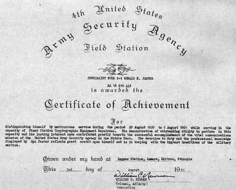| Donald E. Jaster ASA Certificate of Achievement, August 3, 1961. | |