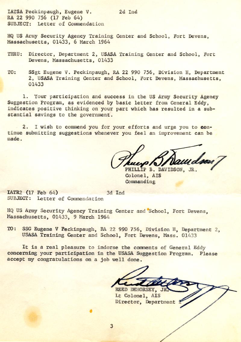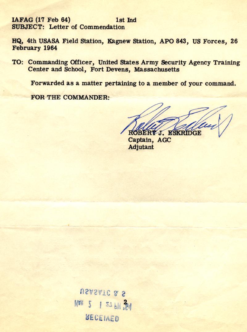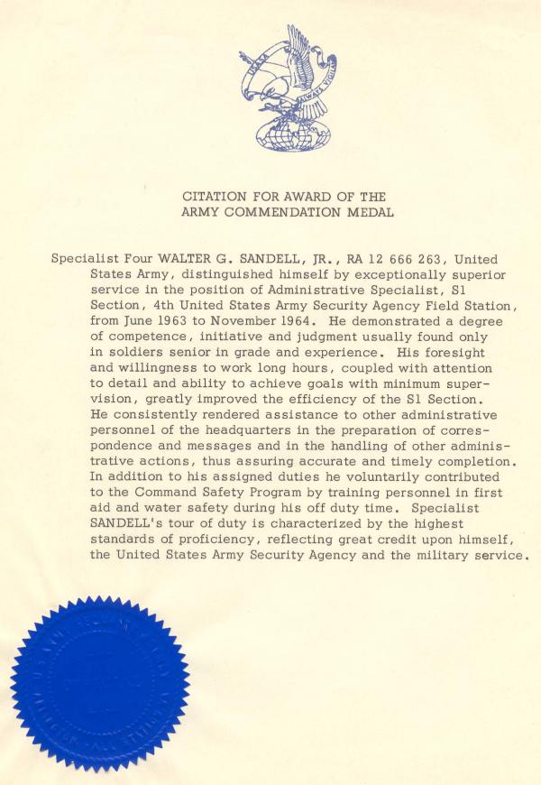 | From Walter G. Sandell Award of the Army Commendation Medal (1964) |