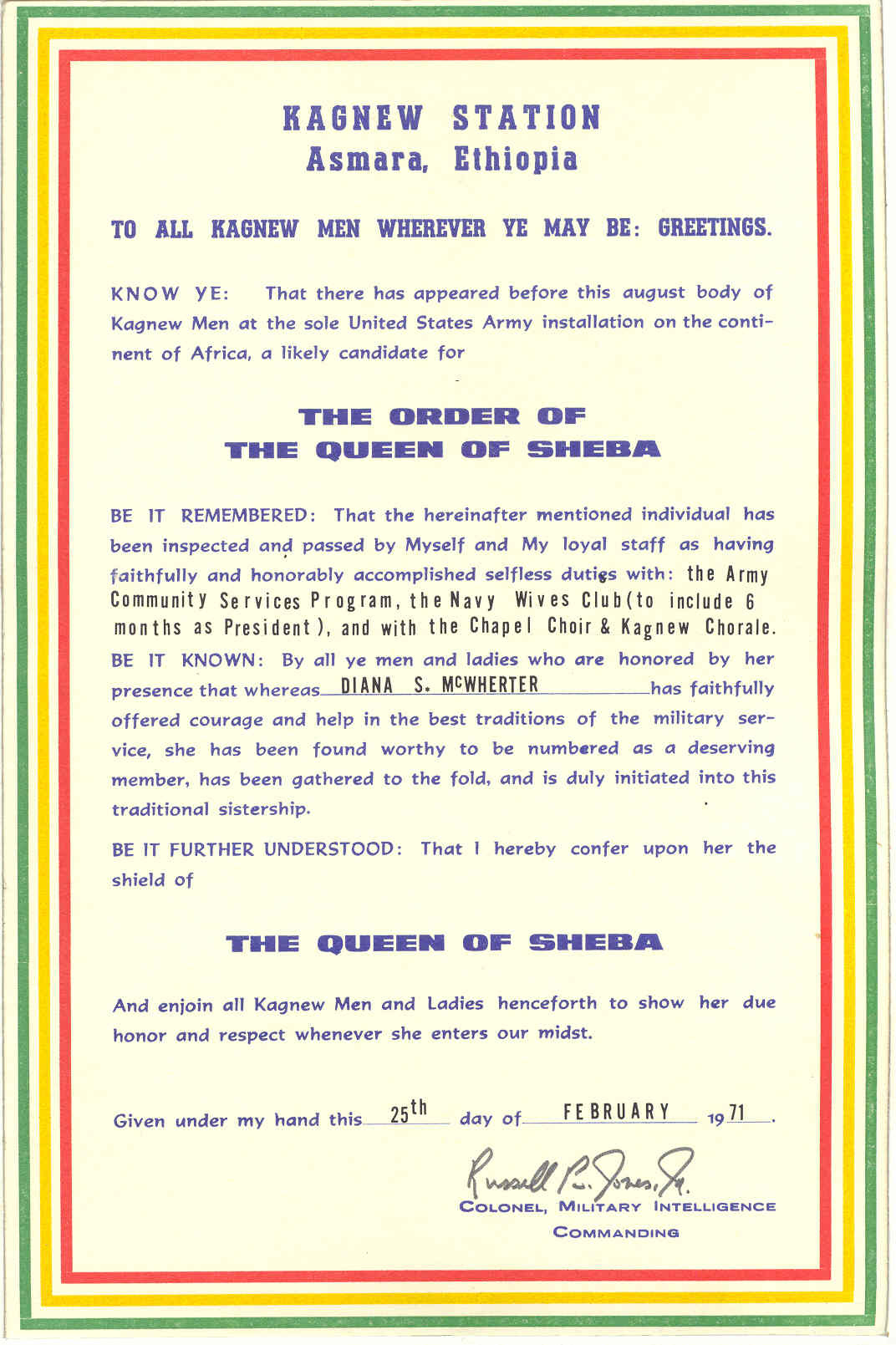 | From Irving L. McWherter (69-71) The Order of the Queen of Sheba as presented to Irving's wife, Diana S. McWherter. He also sent another document which is described as the The Legend of the Queen of Sheba. |