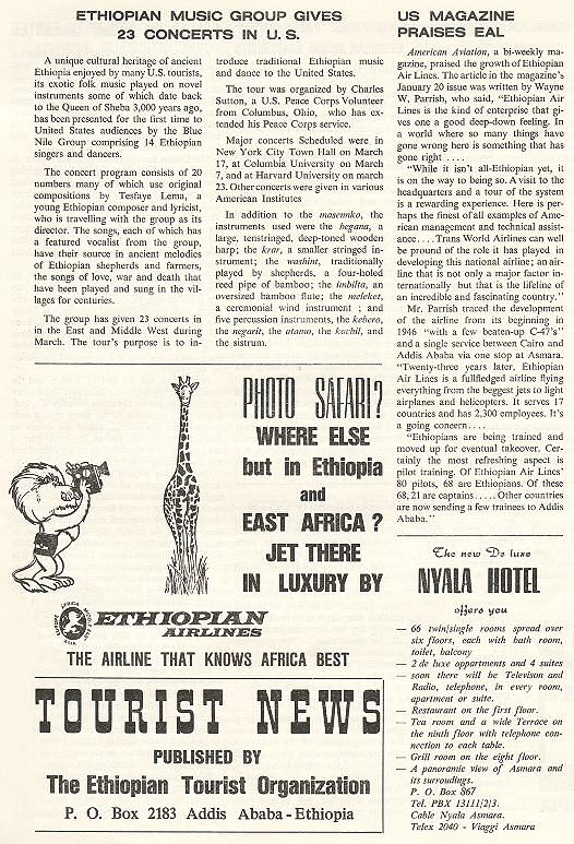 | Ethiopia Historic Tour Guide [Side 1] [Side 2] Ethiopia Tourist News, Vo. 1, No. 3, April 1969 [Cover] [2] [3] [4] Ethiopia Information Guide and Quiz (Updated 9/02/04) (courtesy of George Wagner) |