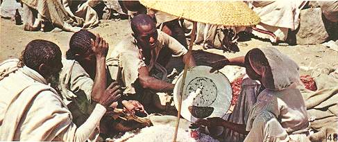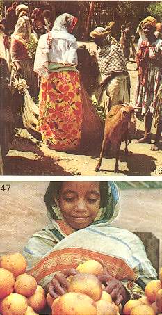 markets of Ethiopia. Every village has its market, every town, every city. Some are tiny, some are large, some are specialised, some are general. All are colourful, all give you an incomparable opportunity of mingling with the people, of getting to know their habits and ways of life. We have already referred to Harrar Market, one of the oldest still flourishing. Ethiopia also boasts the largest open market in the world: in Addis Ababa. Mile after mile, row after row, shop after shop, displaying every kind of merchandise under the sun. Fruit, vegetables, cloth, metal-ware, paintings, scrolls, crosses, wood carvings, ribbons, clothing, books, carpets, jewellery... all displayed in a lavish abundance to be found ![]() |