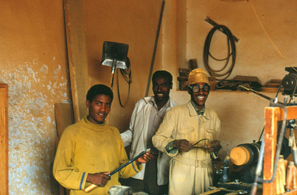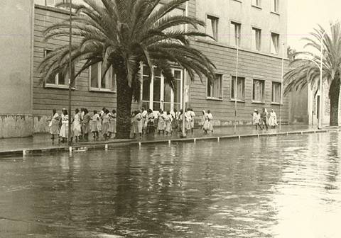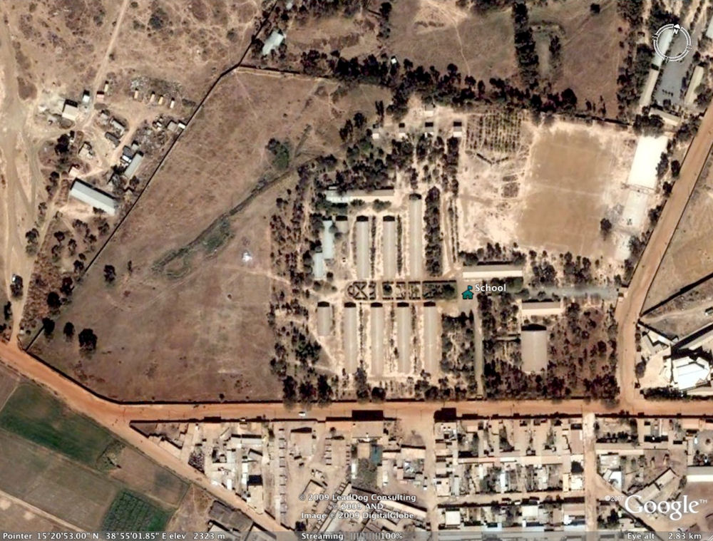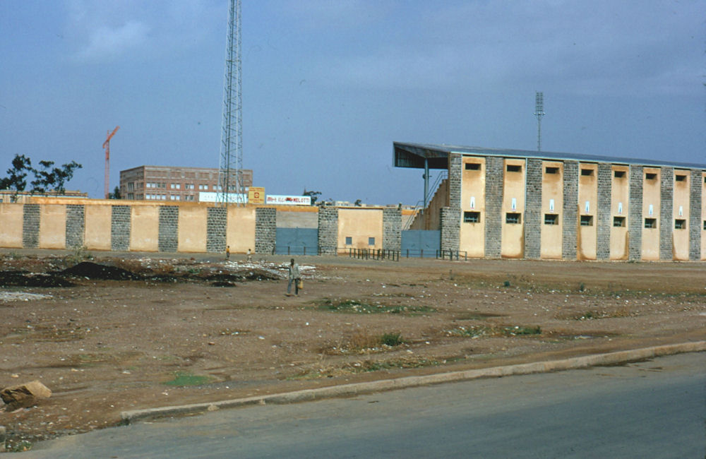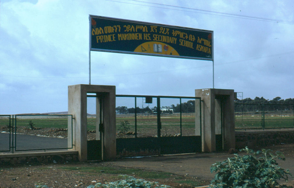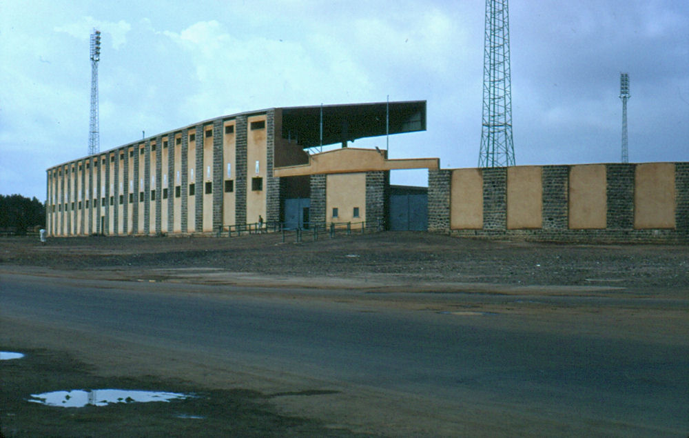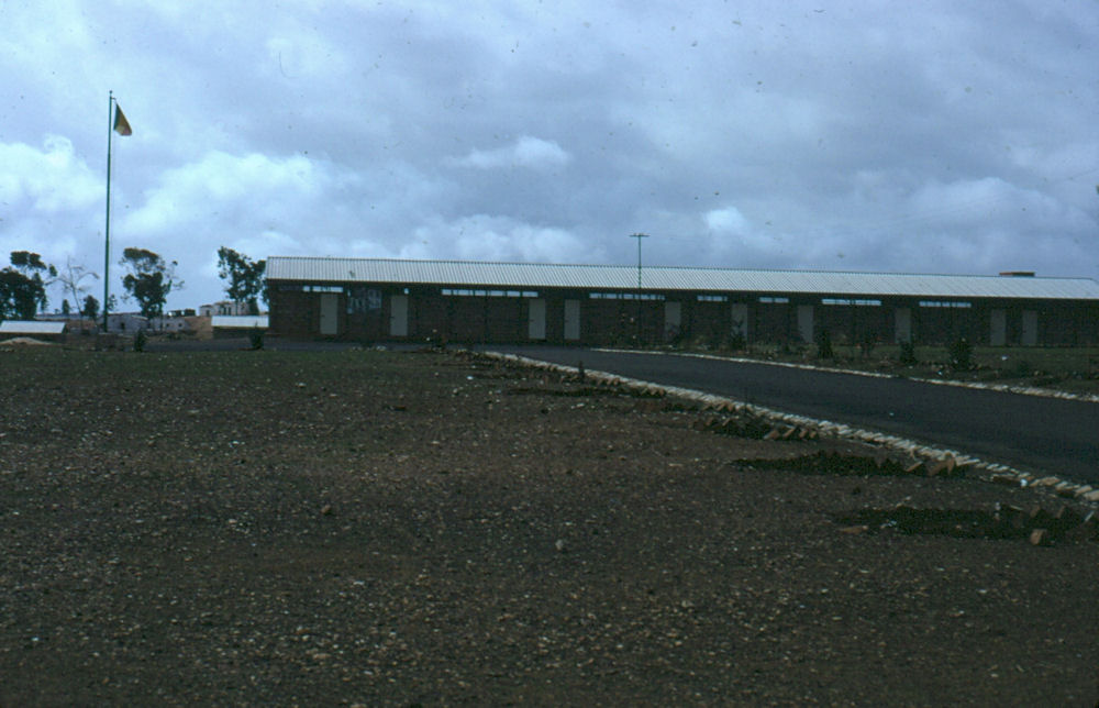 1972: [1] [2] [3] [4] [5] If you drove North from Tract E (Kagnew), headed for STONEHOUSE, you drove past these two locations, major landmarks in Asmara: Soccer Stadium Two views of the soccer stadium, taken from the road, looking South-West (above), and North-West (below). Even with weak lighting from the four towers, the night games were so heavily attended that the overflow crowd would be standing room only inside, with groups outside listening to the public address announcer. On the satellite view, you can still see the four light towers (shadows from a Southern Sun angle, right to left). [1] [2] [Current satellite view] Prince Makonnen School Administration building, you can see that someone got the flag up even on a day off. Some of the classrooms, must have been a weekend or holiday. The main gate "entrance" to the Prince Makonnen School. Most of the children attending this school seemed to be teenagers, so the H.S. may mean High School, not sure. Notice how barren the school grounds appear in the classroom picture. A few planting areas near the road leading from the main entrance to the Admin Building. Compare the above with this satellite view from this past year. Courtesy of Ray Mitzel |