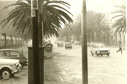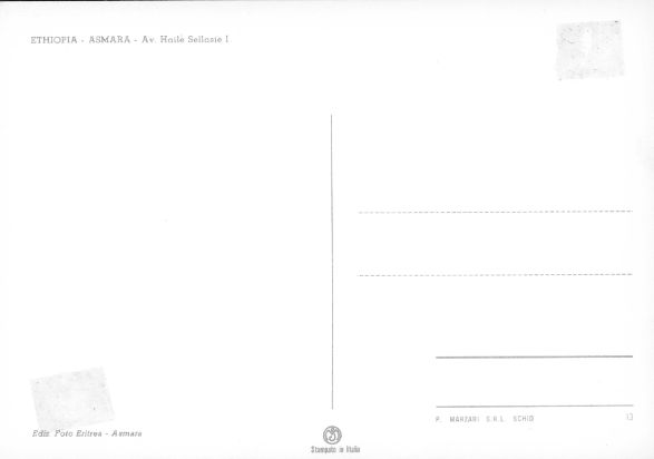 | Chuck shows us it "does" rain in Asmara. [1] [2] A postcard of Avenue Haile Selassie I, or Haile as we knew it. (Front | Back) Courtesy of Chuck Moulton |