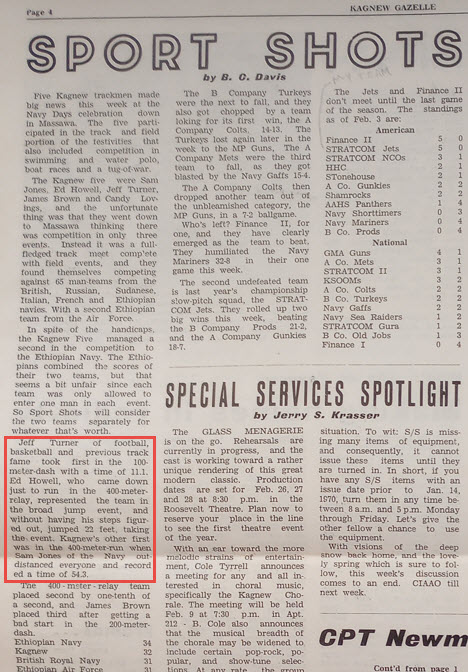 Eddie Howell sent in information about an "all star" team from Kagnew that participated in a track meet against the Air Force in Ankara, Turkey in 1969 and in 1970 at a military invitational which included Great Britain, Italy, Germany, France, Ethiopia, and many other nations in Massawa. Team members that Eddie can remember are: Eddie Howell - 100 meter, long jump, 400 meter relay Harris - high jump Nat Wheeler - 1600 meter relay Jeff Turner - 100 meter, 400 meter relay James Brown - 200 meter, 400 meter relay Candy Lovins - 400 meter relay Sam Jones - 400 meter and 800 meter Eddie sent me some pictures but it will take me a little time to sort them out and figure the best way to present them. Aren't enough hours in the day! For now, here is a scan of the "Sports Shots" section of the Kagnew Gazelle with a brief write up on the Ankara meet. |